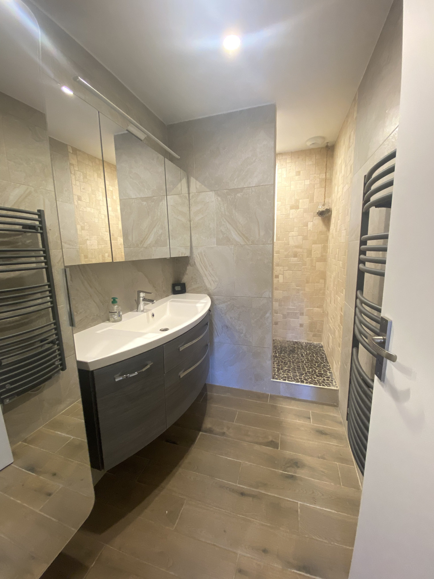Elle se compose d’un hall d’entrée desservant une pièce pouvant faire office de salon ou salle à manger, un grand séjour avec cuisine ouverte équipée, trois chambres dont une avec un grand dressing, une salle d’eau ainsi qu’un WC indépendant.
