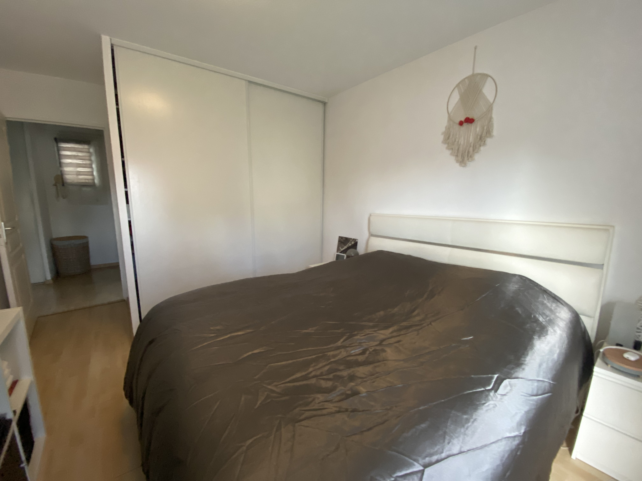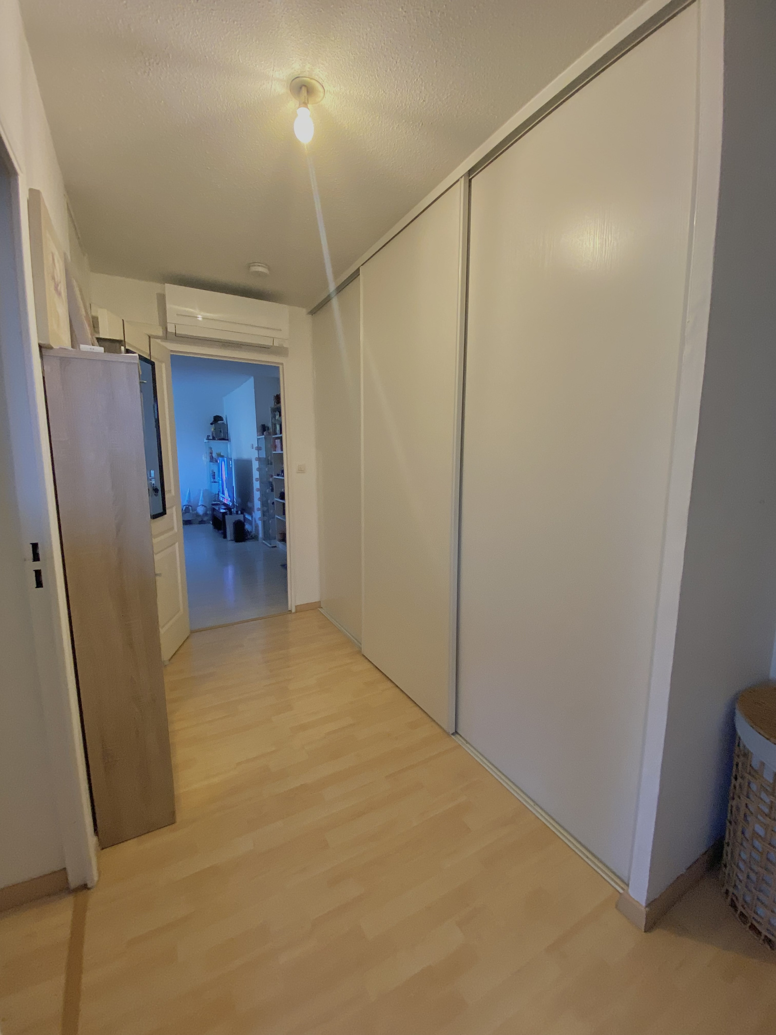 L’appartement dispose de deux chambres avec placards, d’un grand couloir avec rangements, d’un WC séparé et d’une salle de bains.